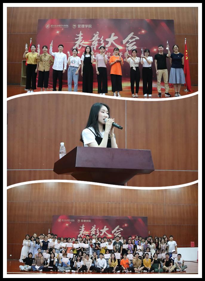 大会首先表彰了5个“优秀班集体”以及83名优秀学生干部,其中包含“优秀部长”“优秀干事”“优秀班助”“优秀班长”“优秀团支书”“优秀考勤员”“优秀学习委员”“优秀生活委员”“优秀心理委员”等。接着,大会表彰了管理学院2018-2019学年“十大之星”,授予张晓芷同学“优干之星”、 李彩容同学“志愿者之星”、林港荃同学“体育之星”、李洵菀同学“进取之星”、蔡万年同学“才艺之星”、洪洁同学“学习之星”、蔡淑宜同学“技能之星”、钟小红同学“自强之星”、郭泽勤同学“考证之星”、曹文丽同学宿舍4人“宿舍之星”等十大称号 ,他们的先进事迹此前已在科技楼一楼进行了为期一周的展示。最后,5名优秀学生代表分享了他们的心得体会以及他们对大学的思考与规划。