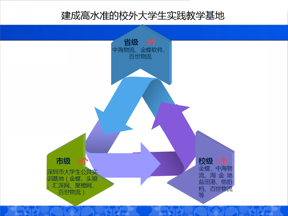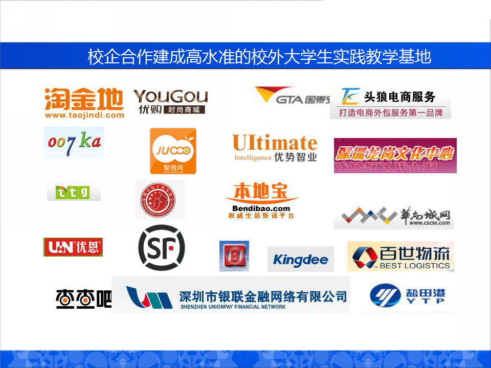 管理学院先后与40多家企业建立了校外实习实训基地。已建成省级大学生校外实践教学基地3个,包括中海物流、金蝶软件、百世物流。已建成市级公共实训基地6个,包括金蝶软件、头狼电商、汇深网、聚橙网、百世物流、盐田港国际基地。